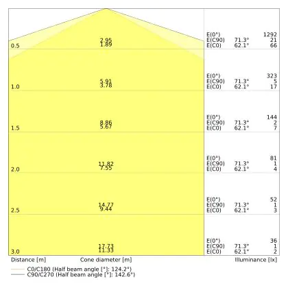 De lichtopbrengst (Lumen), geeft weer hoe krachtig het uitgestraalde licht is. Dit is belangrijk om te weten om de juiste sfeer te creëren. 0 tot 400 Lumen is bij uitstek geschikt voor accent- of sfeerverlichting. Een hoger aantal Lumen is, afhankelijk van de grootte van de ruimte, beter geschikt als ondersteunende- of basisverlichting. Heb je plafonds hoger dan 4 meter, dan is een lichtopbrengst van minimaal 8000lm aan te raden indien heldere verliching gewenst is (vb. in werkomgevingen).
