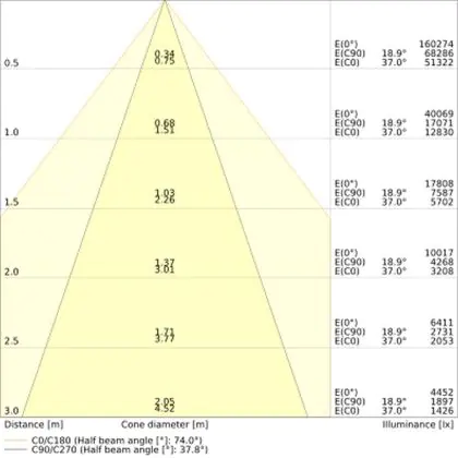 De gradenbundel geeft informatie over hoe breed het licht wordt uitgestraald. Dit zit tussen de 0 en 360 graden (D). Hoe kleiner de hoek, hoe specifieker de lichtbundel is. Over het algemeen is een smalle gradenbundel perfect voor sfeer- of accentverlichting, terwijl een brede gradenbundel ideaal is om grote oppervlaktes te verlichten.