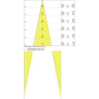 De gradenbundel geeft informatie over hoe breed het licht wordt uitgestraald. Dit zit tussen de 0 en 360 graden (D). Hoe kleiner de hoek, hoe specifieker de lichtbundel is. Over het algemeen is een smalle gradenbundel perfect voor sfeer- of accentverlichting, terwijl een brede gradenbundel ideaal is om grote oppervlaktes te verlichten.